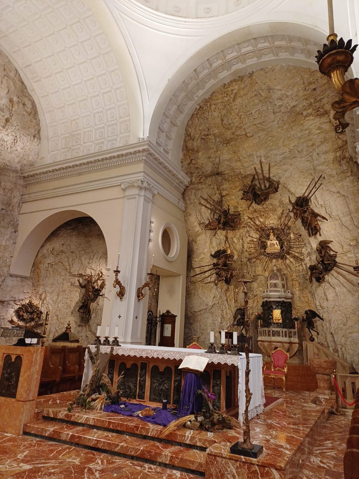 La posizione del santuario permette anche di riflettere sul rapporto tra l’uomo e l’ambiente naturale. Proprio come abbiamo visto al mattino con la centrale eolica, anche qui il paesaggio gioca un ruolo fondamentale: le montagne, la roccia e la valle creano un contesto unico che rende questo luogo particolarmente suggestivo.